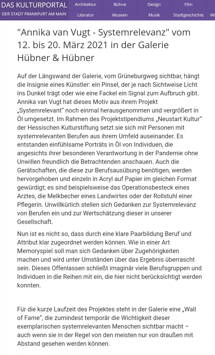 "In ihrer verfeinerten Lasurtechnik altmeisterlich anmutenden Portraits betreibt Annika van Vugt eine Art Wiedergutmachung an ihrem Künstlerfreund Volker Bradke. Als junger Mann 1966 von Gerhard Richter in richterscher Manier gemalt und gefilmt, wenig später in der Kunstszene degradiert, hat ihn dieses Schicksal vermutlich psychisch und in der Folge auch physisch zerstört. Mit ihren ´anti-richterschen`Portraits gibt Annika van Vugt dem ehemaligen Marburger Bürger sein Würde zurück" Edgar Zieser - Kunst in Marburg 2020. Eine Annäherung im Rundgang