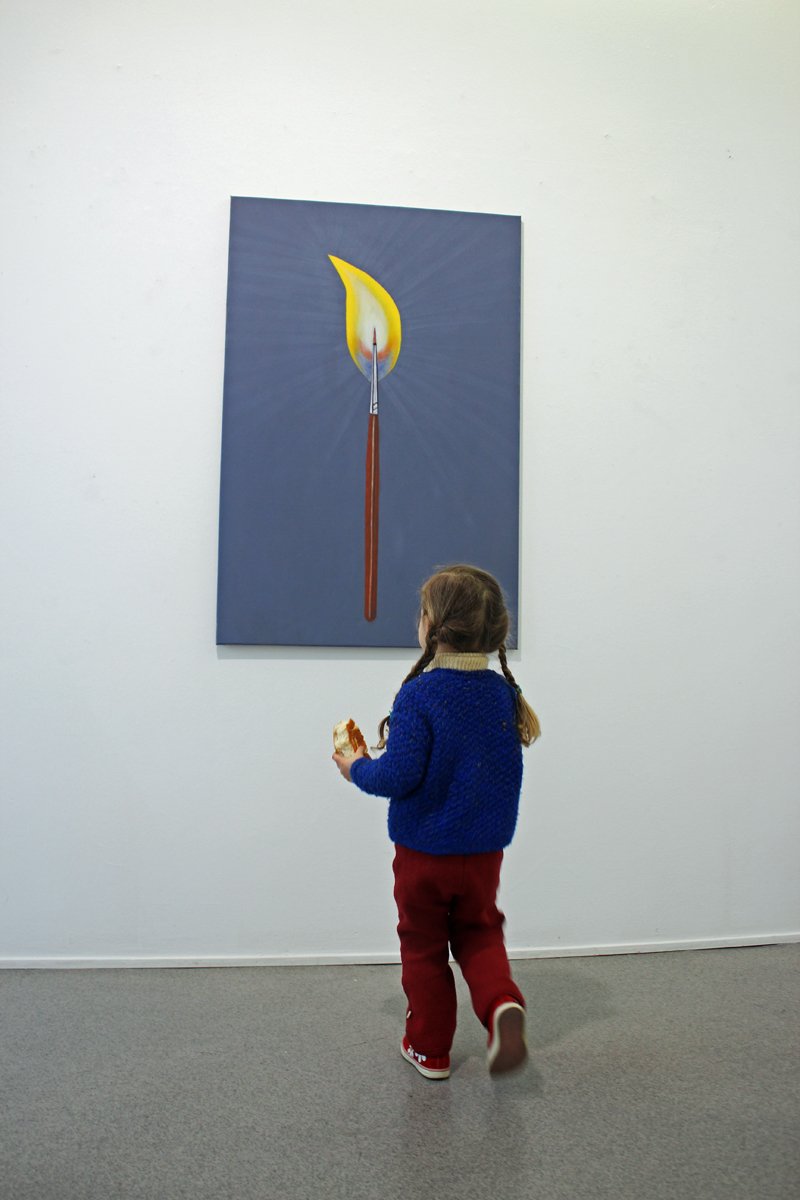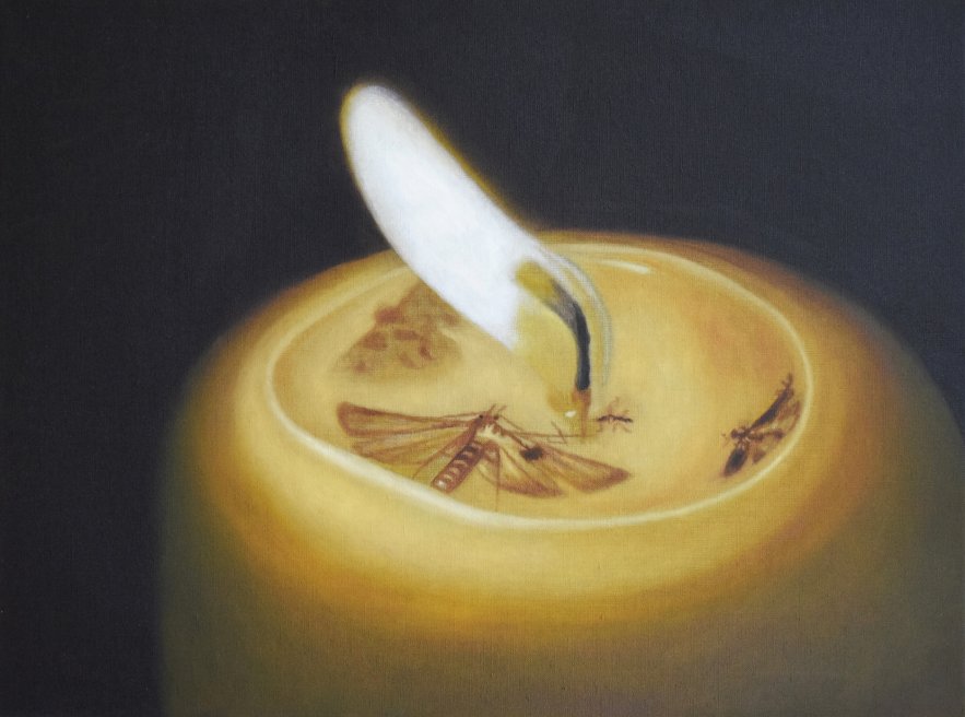 Ganz offensichtlich nicht für immer. Bei Annika van Vugts „Die Falle“ (2016) kommen mehrere dieser Aspekte zum Tragen. In Öl auf Leinwand lässt sie den von rechts kommenden Luftzug erahnen, der die Flamme flackern lässt und zur Seite neigt. Wohl ein offenstehendes Fenster oder versucht gerade jemand, die Kerze auszublasen? Wird sie im nächsten Augenblick gar erlöschen? Erloschen jedenfalls ist bereits das irdische Dasein vierer Insekten, die im Kerzentalg (für die Ewigkeit?) konserviert sind. Der für uns gemütlich anmutende Kerzenschein wurde zur tödlichen Falle für die sonst mit großer Leichtigkeit im Sonnenlicht silbern schimmernden, umherflatternden Geschöpfe. In ihrer schimmernd durchsichtigen Leichtigkeit des Seins strebten sie dem Licht entgegen und opferten sich. Das Bild zieht die Blicke des Betrachters immer wieder magisch an und lässt den Gedanken freien Raum. Die altmeisterlich wirkenden Farben und der dunkle Hintergrund geben dem Bild fast etwas Surreales, Rätselhaftes. Zugleich strahlt es eine Ruhe aus, etwas Existenzielles, erfüllt es die Sehnsucht nach Wärme und Licht.